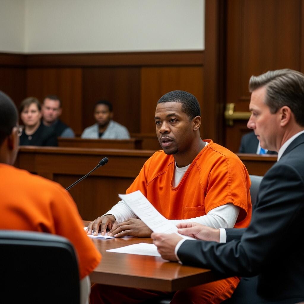 The defendant, who was wearing a jumpsuit was sitting at the defense table.